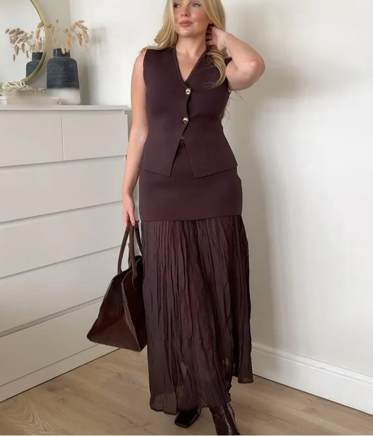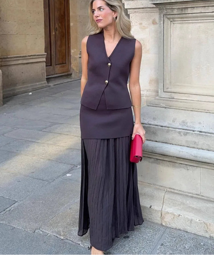 A saia longa apresenta modelagem reta e cintura alta, valorizando a silhueta com conforto e imponência. O colete de alfaiataria, com corte ajustado, gola tradicional e fechamento frontal por botões, garante um toque sofisticado e moderno. Ambos são confeccionados em tecido estruturado de alta qualidade, com acabamento impecável e toque macio.
