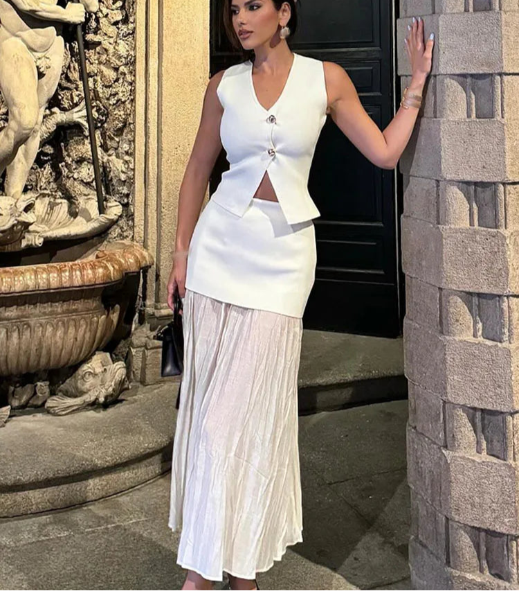 O Conjunto Feminino Moderna Roma é a escolha perfeita para mulheres que valorizam sofisticação, caimento impecável e estilo refinado. Composto por uma saia longa de alfaiataria e um colete estruturado, esse conjunto traz um visual contemporâneo com forte inspiração clássica. Ideal para ocasiões que exigem presença marcante e elegância discreta, é a união perfeita entre o minimalismo e o poder da alfaiataria feminina.